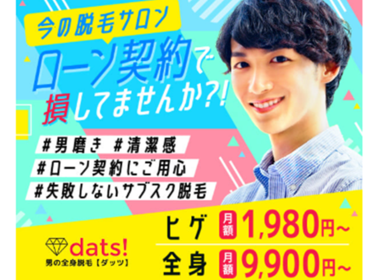 「男の全身脱毛dats!【ダッツ】」は、男性専用の全身脱毛・ヒゲ脱毛・VIO脱毛専門サロンです。初めて脱毛を検討している方でも安心して通える料金体系と、快適な施術環境が魅力。清潔感のある空間で、男性特有の濃く太い毛にも対応できる高性能脱毛機を使用し、理想の肌へと導きます。