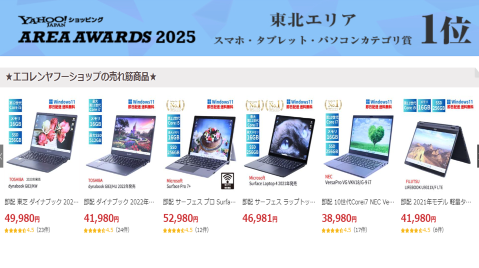 「エコレンヤフーショップ」は、初心者から上級者まで誰でも使いやすい豊富な商品、丁寧な情報掲載、サービスの速さといった総合力の高い中古PC専門通販サイト</strongです。1点ごとの状態が確認できる安心感と、スピーディな発送対応は、初めての中古PC購入にも最適。購入後の満足度を高める様々な工夫がされているので、ぜひ公式ストアページで気になる商品をチェックしてみてください。