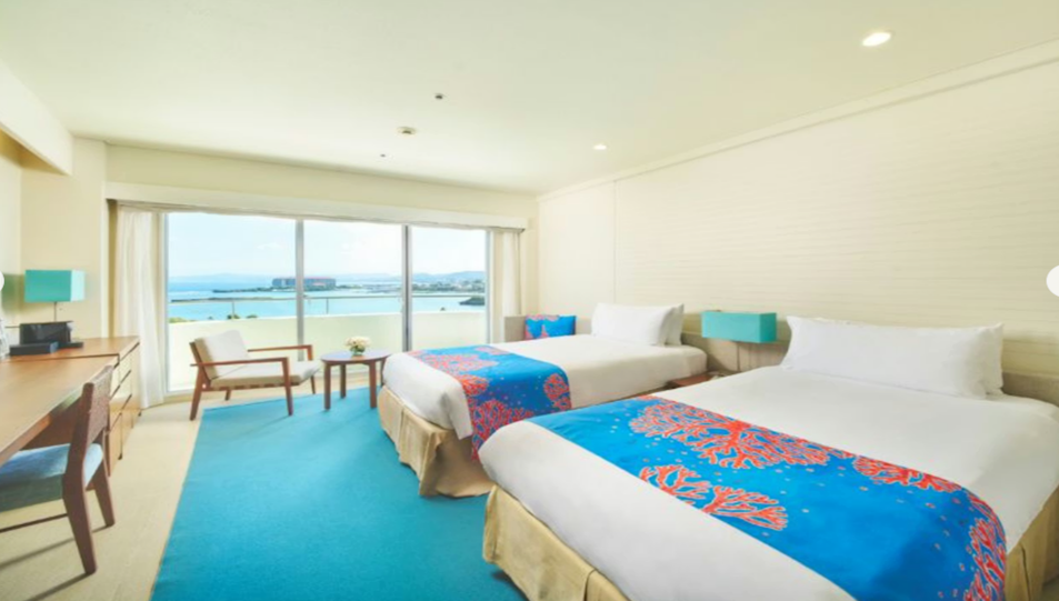客室はオーシャンビューを中心に、開放感あふれる設計が特徴。沖縄の海や空をイメージした爽やかなインテリアが、心地よいリラックス空間を演出します。