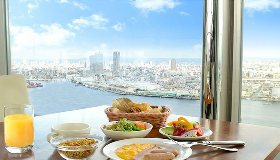 32階のスカイレストランでは、絶景を眺めながら朝食ビュッフェを楽しめます。「ホテル 朝食 おすすめ 大阪」としても評価が高く、焼きたてパンや和洋バイキング、大阪名物グルメなど豊富なメニューが魅力です。