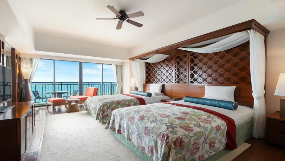 客室は全室バルコニー付きで、オーシャンビューやハーバービューなど、沖縄の自然を感じられる設計になっています。広々とした空間と落ち着いたインテリアが魅力で、非日常のリラックス空間を演出。さらに、上層階のプレミアムクラブフロアでは専用ラウンジやコンシェルジュサービスも利用でき、ワンランク上の滞在を楽しめます。