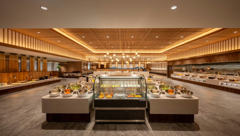 食事はライブキッチン付きのビュッフェスタイル。