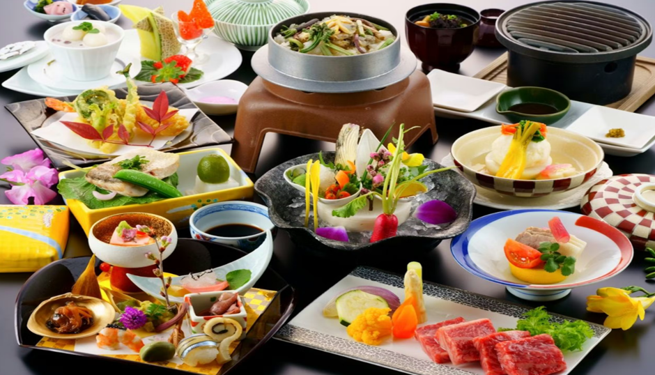 伊勢海老や鮑、長崎牛など、旬の食材を活かした料理が並び、