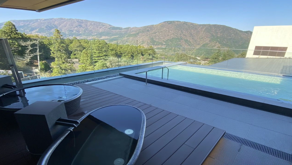 最上階には箱根の山々を一望できる大浴場があり、開放感あふれる露天風呂を楽しめます。さらに、貸切風呂も複数用意されているため、プライベートな時間を大切にしたい方にもおすすめです。