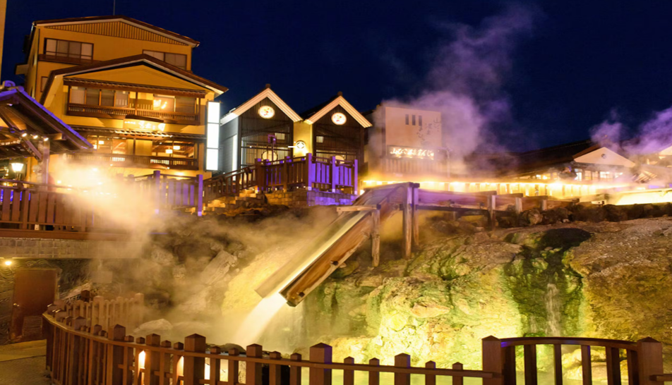 湯畑草菴の最大の特徴は、草津温泉の中心「湯畑」のすぐ目の前という立地です。観光スポットや飲食店、お土産屋が集まるエリアに位置しているため、時間を無駄にすることなく効率よく観光を楽しめます。特に夜のライトアップされた湯畑は幻想的で、宿泊者だけが味わえる特別な時間を演出してくれます。