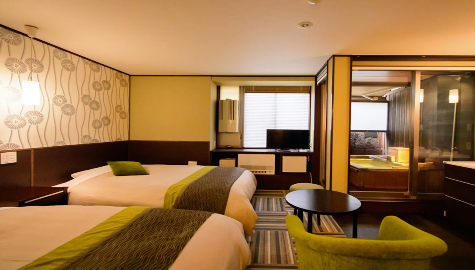 客室は全16室とコンパクトながら、露天風呂付き客室や湯畑ビューの部屋など多彩なタイプを用意。特に湯畑を一望できる客室では、窓の外に広がる温泉情緒を独り占めできます。