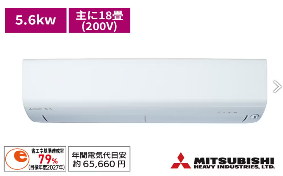 特に、18畳クラスの広めのリビングや、家族が集まる空間にしっかり対応できるモデルを探している方には相性のよい商品です。冷房は木造15畳から鉄筋23畳、暖房は木造15畳から鉄筋18畳が目安となっており、パワーが必要な部屋でも選びやすい仕様です。200V対応モデルなので、広い空間を快適に保ちたい方にも向いています。